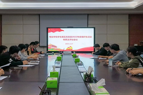 2023年3月17日晚上,电信学生第五党支部在5-419会议室召开了召开2022年度组织生活及民主评议会议,会议由支部书记李新同志主持,支部在校全体党员参加会议。