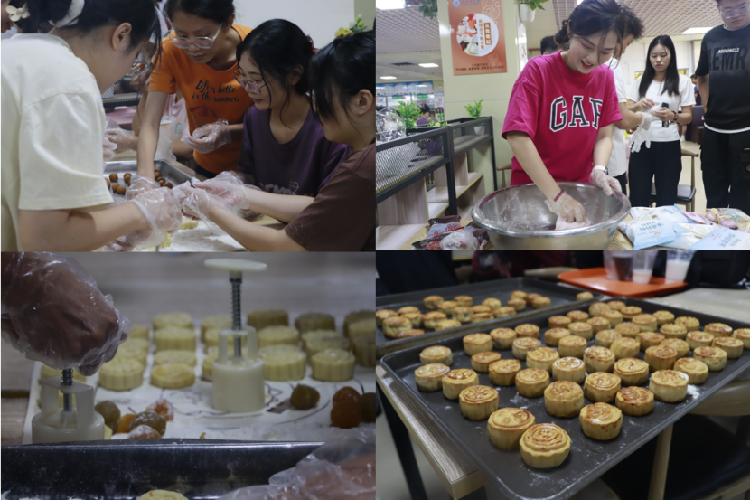 活动现场热闹非凡。各种月饼模具、面粉、馅料等整齐摆放,空气中甜香弥漫。同学们专注地制作月饼,动作轻柔细致,熟练使用模具,将面团压制成精美图案。大家互相交流技巧,时而传出轻松笑声,忙碌而有序。冰皮月饼以其独特的色彩和口感成为现场的一大亮点,同学们创意十足地选择馅料和搭配颜色,如彩云般美丽,不仅展现了年轻一代的活力与想象力,更寓意着团结与友谊的美好愿景。师生共同参与,体验了手工制作的乐趣,分享中秋习俗和历史故事,气氛轻松愉快,增进了师生之间的情感。