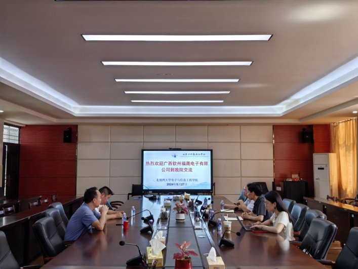 527午,广西钦州福晟电子有限公司刘遵义总经理和张双北副总经理一行院进行交流访问院长王远干、胡俐蕊博士和潘敏玲老师参加交流座谈。