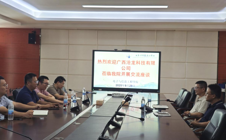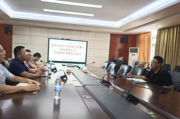 9月29日,"深海潜行者"广西自贸区丰翼飞科技有限公司总经理李宝龙、"蓝天巡航者"广西沧龙科技有限公司副总经理仝强一行到访电信学院,与学院副院长刘秀平、院长助理计科系主任徐涛、人工智能系主任罗俊琦、电子系副主任邢医等座谈交流,共商合作事宜。
