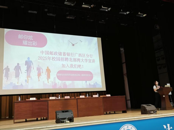 2024年9月24日下午16点,中国邮政储蓄银行广西区分行在我校大礼堂召开了面向电子与信息工程学院2025届毕业生的专场招聘宣讲会,企业招聘负责人米小妹总经理做宣讲,电信学院各专业毕业班学生听取了宣讲。