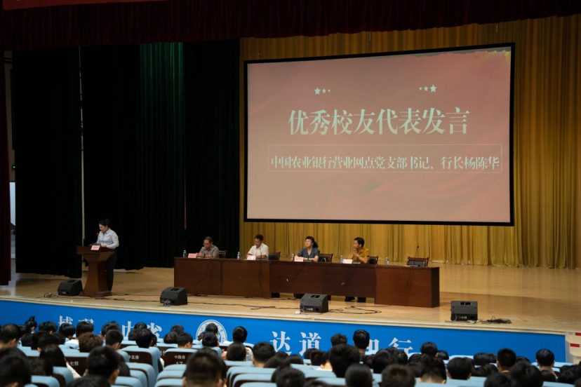 我院邀请了杰出校友代表——中国农业银行某营业网点党支部书记、行长杨陈华学姐作为特邀嘉宾进行发言。杨陈华学姐的归来,不仅带着她在职场上拼搏奋斗的辉煌成就,更怀揣着对母校深深的眷恋与感激之情。