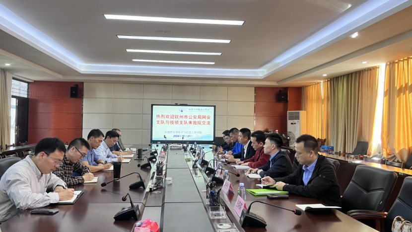 11月21日下午,钦州市公安局网安支队政委陈建德与技侦支队支队长卢如俊一行八人到我院调研交流。我院院长王远干、副院长邓安安、农国才等参加了座谈会。