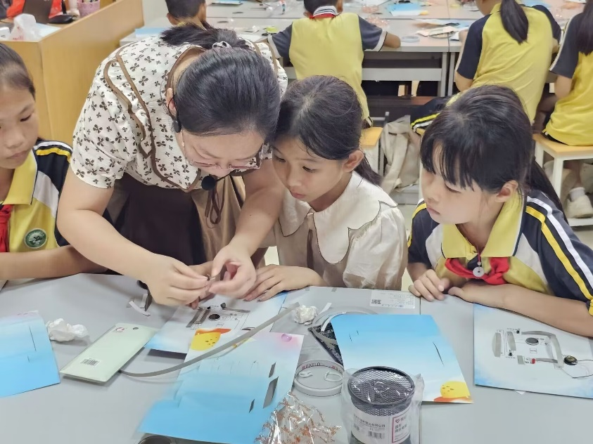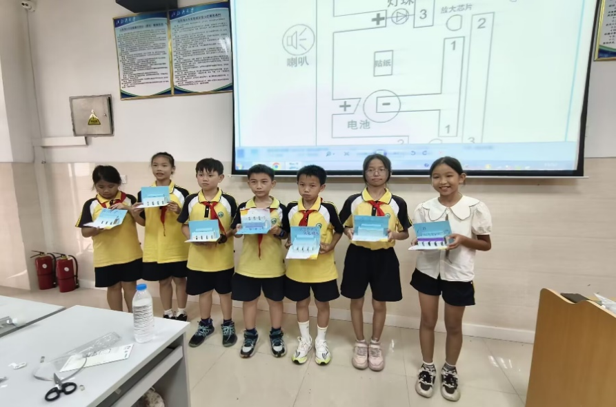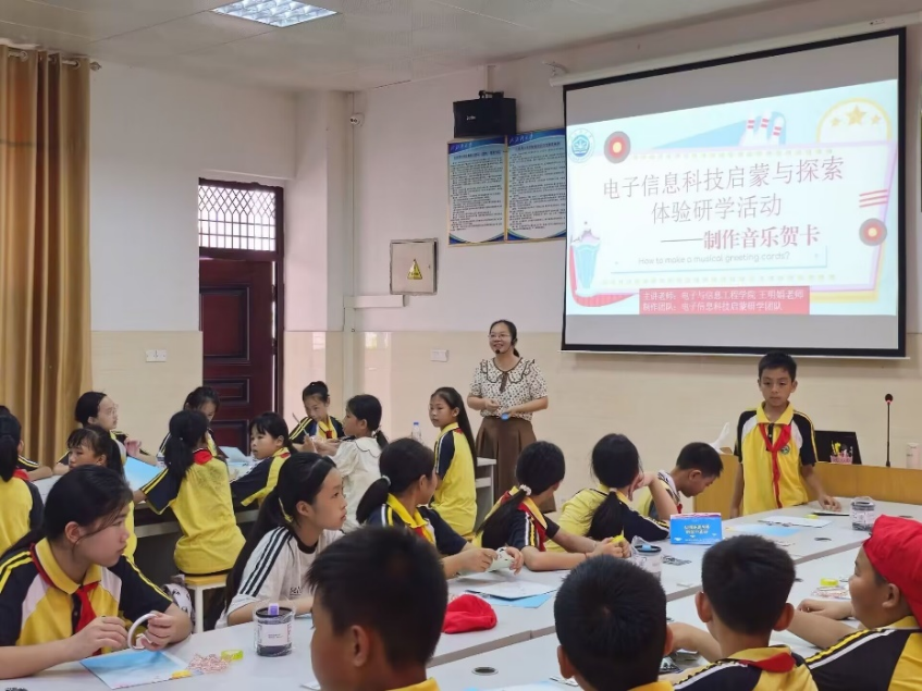活动现场,孩子们身着整齐的校服,聚精会神地聆听王老师的讲解。本次研学活动以“制作音乐贺卡”为主题,旨在通过寓教于乐的方式,让孩子们在实践中感受电子信息科技的魅力。