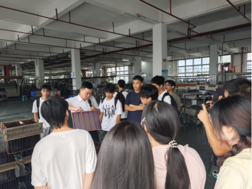 上午,研学团队首站抵达贵港市西江工业园区。在贵港万吉电子有限公司,学生们深入生产线观摩电子产品制造全流程,了解物联网技术在智能终端领域的应用前景。企业技术负责人现场讲解“精密电路板焊接工艺”等核心环节,引发学生们的热烈讨论。随后,团队前往广西绿源电动车有限公司,对比锂电池与铅酸电池的技术差异,并通过座谈会探讨新能源交通产业的竞争策略。“这次参观让我对绿色能源技术有了更直观的认识,未来职业规划也更清晰了。”电子与信息工程学院学生唐秀榛表示。