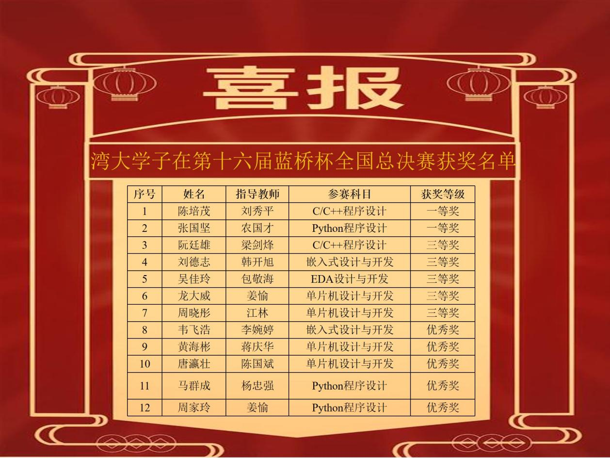 6月15日,第十六届“蓝桥杯”全国软件和信息技术专业人才大赛(软件类、电子类)全国总决赛在30个省市自治区,58个高校赛点同步举行,我校12位获得省赛一等奖的同学分别在广西民族大学和广西师范大学参加了软件赛和电子赛国赛。23日,成绩揭晓,我校参赛学子获得一等奖2项、三等奖5项、优秀奖5项。